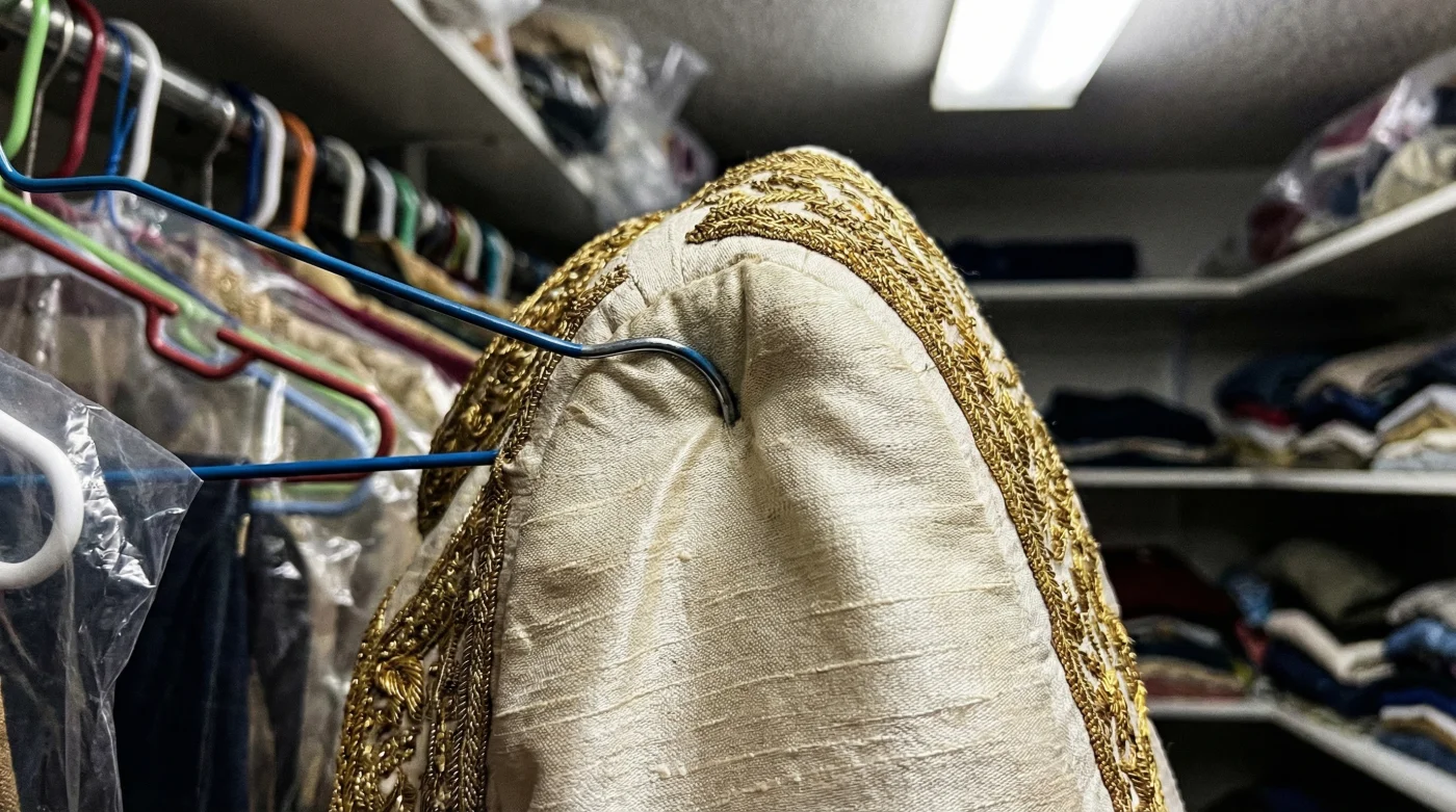 Never compress heavily embroidered garments in a packed closet. The friction from adjacent clothing can snag delicate threads and crush the shoulder structure. Allow a minimum of 5 centimetres of breathing room on either side of the garment. Maintain a closet temperature of approximately 18 to 20 degrees Celsius, with a relative humidity of 45 percent, to prevent the natural fibres from becoming brittle or overly relaxed.